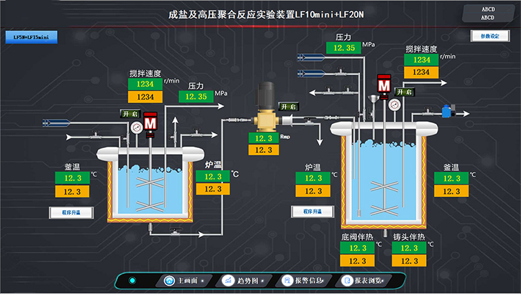 觸摸屏界面可設(shè)定實(shí)驗(yàn)所需的溫度、攪拌速度,檢測(cè)顯示實(shí)際溫度、壓力、轉(zhuǎn)速,控制攪拌器、平流泵、冷水機(jī)的開啟、關(guān)閉等。