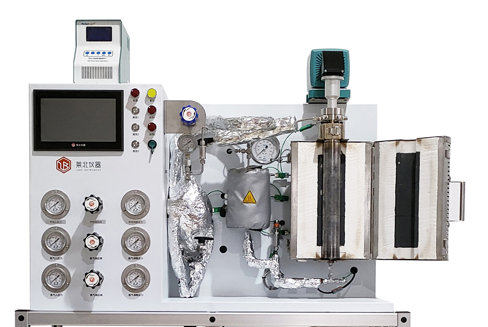 桌面式光催化裂解流化床反應(yīng)裝置包括:反應(yīng)系統(tǒng)、氣體進(jìn)料系統(tǒng)、液體進(jìn)料系統(tǒng)、預(yù)熱系統(tǒng)、反應(yīng)產(chǎn)物分離收集及分析系統(tǒng)、控制系統(tǒng)等。反應(yīng)管配有高壓可視窗口,可將光源引入催化劑床層。