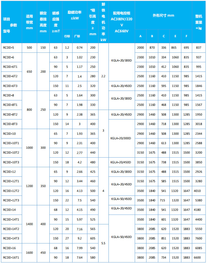 四、RCDD系列懸掛帶式自冷電磁除鐵器主要技術參數、外形尺寸 執行標準:JB/T7689