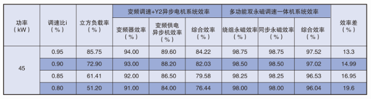 下表為與平方轉(zhuǎn)矩系統(tǒng)45kW-4(Y2系列異步電機(jī)使用變頻供電)同工況效率對(duì)比