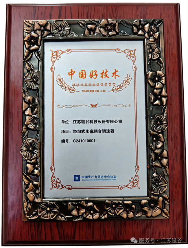 在科技創新的浪潮中,江蘇磁谷再次以硬核實力閃耀行業! 近日,公司自主研發的“繞組式永磁耦合調速器”技術,經過中國好技術評審委員會嚴格評審,被正式授予2024年度“中國好技術”稱號。這一榮譽不僅是對技術先進性的權威認可,更是對江蘇磁谷在永磁傳動領域持續突破的肯定。